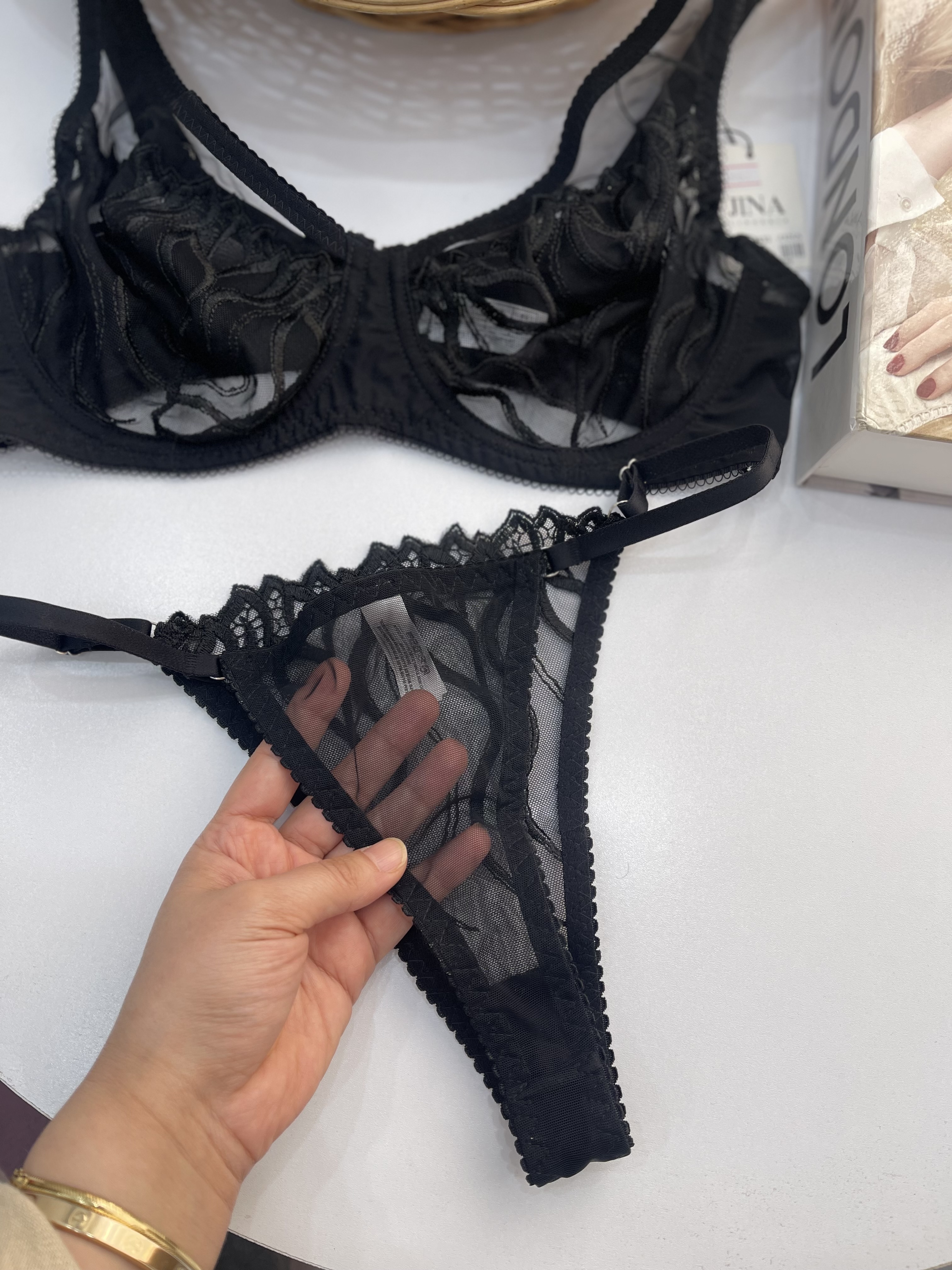 جنسترکیب تور و گلدوزیرنگمشکیجزئیاتفنردار.کاپ D.شورت لامبادا. سه قزنه.تنظیم کننده بنده شورت.سایز شورت با سایز سوتین هماهنگی دارد